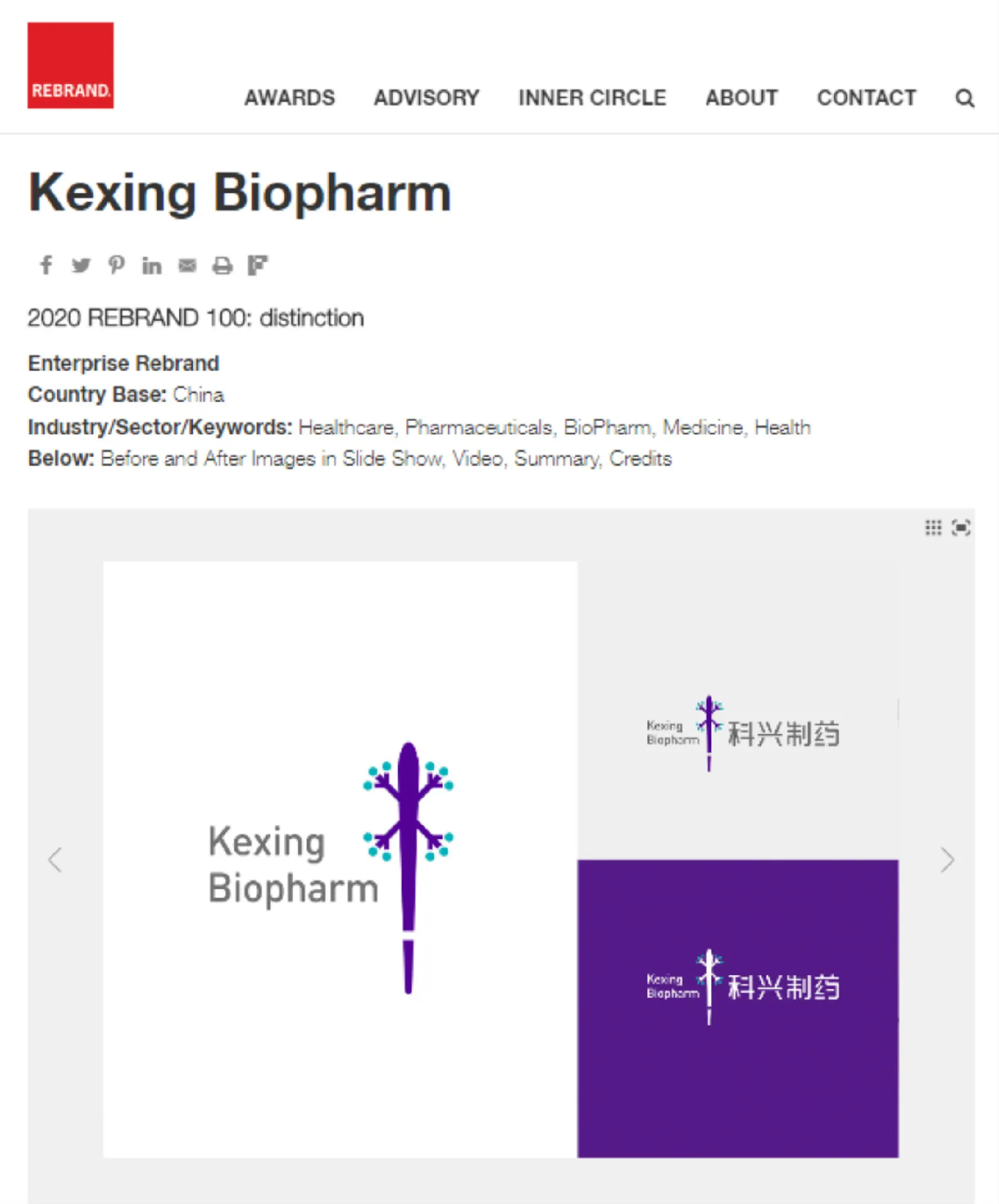 On February 28, 2020, the final winners of the 2020 REBRAND 100® Global Awards were announced. A total of 100 entrants from around the globe became the recipients of awards in the three categories: Best of Awards, Distinction, and Merit. Only five entries scoring the highest among 100 recipients racked up the Best of Awards, 45 with lower scores won the Distinction, and, in the near future, the remaining 50 Merit winners will be announced on Rebrand's website in the form of gallery showcase. Kexing Biopharm entered the final list of the 2020 Distinction winners with its brand visual upgrading program developed by MetaThink.
