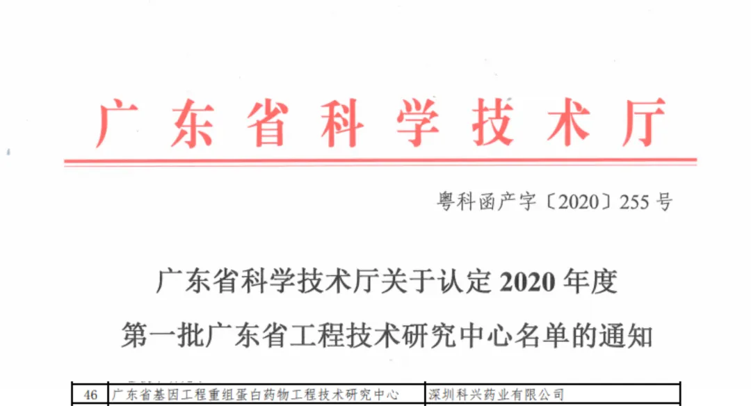 深圳科兴药业被认定为“广东省基因工程重组蛋白药物工程技术研究中心”